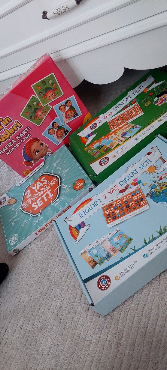 2 yaş çocuklar için hafıza ve dikkat geliştiren renkli, eğitici kart oyunları seti. IKIZLERIM OLDUGU ICIN IKI TANE ALMISTIM AMA BIZE BİR TANESI YETERLI OLDU . GORDUGUNUZ GIBI BIR TANESI HIC KULLANILMADI DIGERI ISE BENIM KONTROLUMDE YAPILDI TERTEMIZDIR.