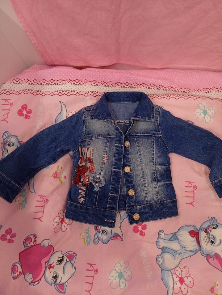 Düğmeli, nakışlı desenlere sahip mavi kot ceket. Renkli ve dar kesimli, notched yakalı, sokak modasına uygun. 2 yaş kız çocuk kot ceket