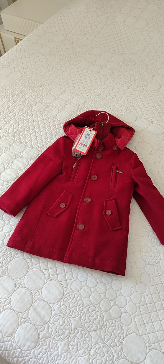 2 yaş kız çocuk kaşe mont sıfır/etiketli ürün. Düğmeli ve fermuarlı önü ve kesik yakası olan, bordo renkli, kapüşonlu erkek/kız çocuk kabanı. Yumuşak ve sıcak kumaştan üretilmiştir.