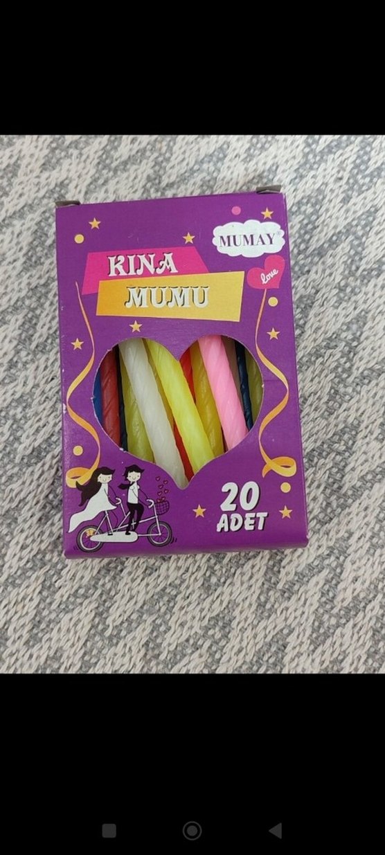 Kına gecesi için 20 adet renkli mum içeren paket. Mumlar çeşitli renklerde olup mor kutuda sunulmuştur. ️
