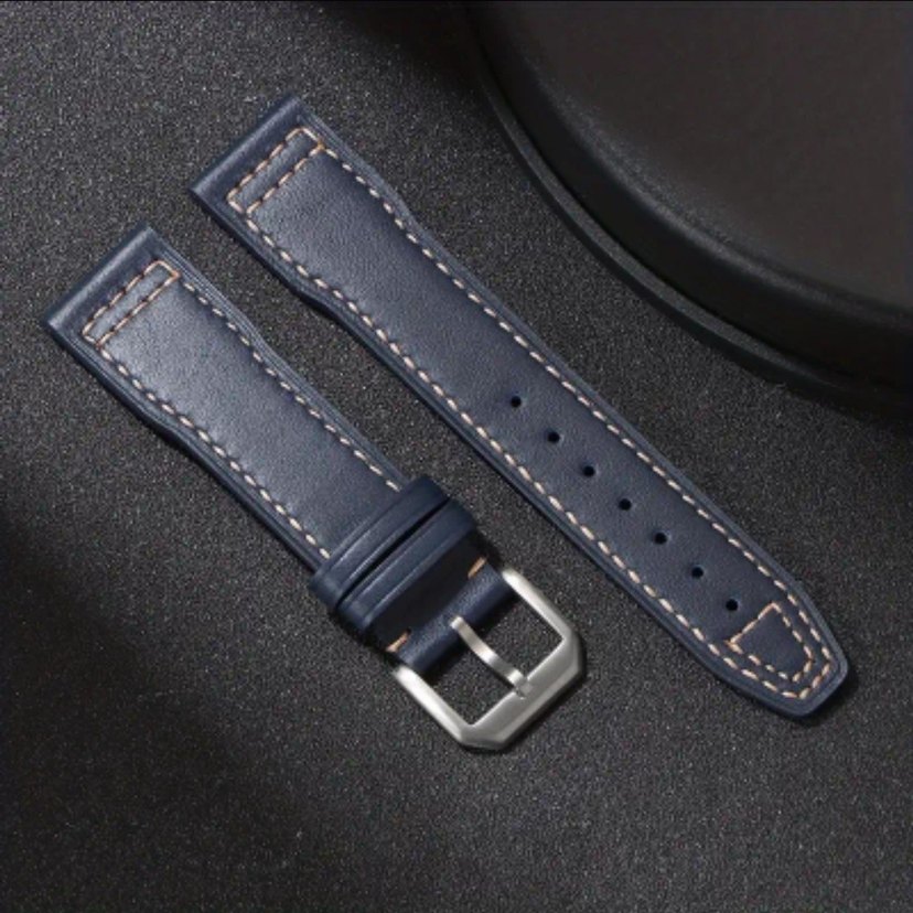 Koyu mavi deri ve klasik beyaz dikiş detaylı erkek saat kayışı, metal tokalı.