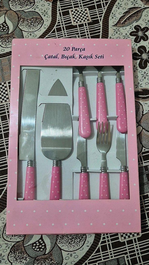 20 parçadan oluşan bu çatal, bıçak ve kaşık seti, beyaz puantiyeli pastel pembe saplara sahiptir.