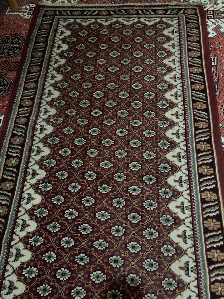 KONDİSYON • Genel durumu iyi • Belirgin delik, çürük yok • Uç püsküllerde hafif kullanım izi (normal) • Renklerde canlılık korunmuş MALZEME & DOKUMA • Hav: Yün (makine değil, el dokuma hissi net) • Çözgü: Pamuk (arka yüz fotoğrafı bunu destekliyor) • Düğüm: Türk (Gördes) düğümü • Düğüm sıklığı: Orta – düzgün ve simetrik Tür: El dokuma halı Desen: Tekrar eden göbekli (Buhara / Yomut esintili) Zemin Rengi: Bordo Kenarlar: Klasik geometrik bordür Ölçü: Yaklaşık 190–195 cm x 90–100 cm (fotoğrafta 1,93 m uzunluk görünüyor) Kullanım: Yolluk