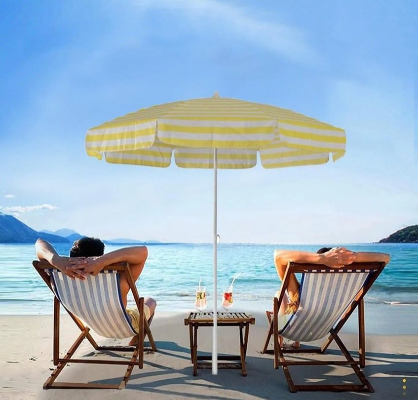 Sarı çizgili, minimalist tasarıma sahip plaj şemsiyesi. Dayanıklı beyaz direği ve hafif kumaş tentesi ile güneşten koruma sağlar. ☂️