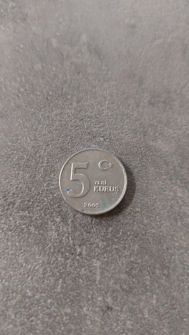 2005 yılına ait gri renkte 5 Yeni Kuruş madeni para, minimal ve sade tasarıma sahip, ay ve yıldız simgeli.