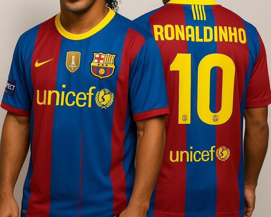 Takım: FC Barcelona Oyuncu İsmi: Ronaldinho Forma Numarası: 10 Renkler: Kırmızı & Mavi (klasik Barça çubuklu tasarım) Üretici Marka: Nike Sponsor: UNICEF (ön kısımda) Ek Detaylar: FIFA World Champions 2009 arması (ön göğüste) UEFA "Respect" arması (kol kısmında) Arkada “RONALDINHO” yazısı ve 10 numara altında küçük Barcelona logoları Yaka: Sarı detaylı yuvarlak yaka Dri-FIT etiketi (alt kısımda)