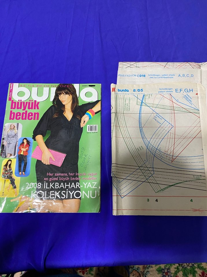 2008 İlkbahar-Yaz Burda büyük beden moda modelleri ve A,B,C,D,E,F,G,H desenleri içeren dikiş kalıpları içerir.