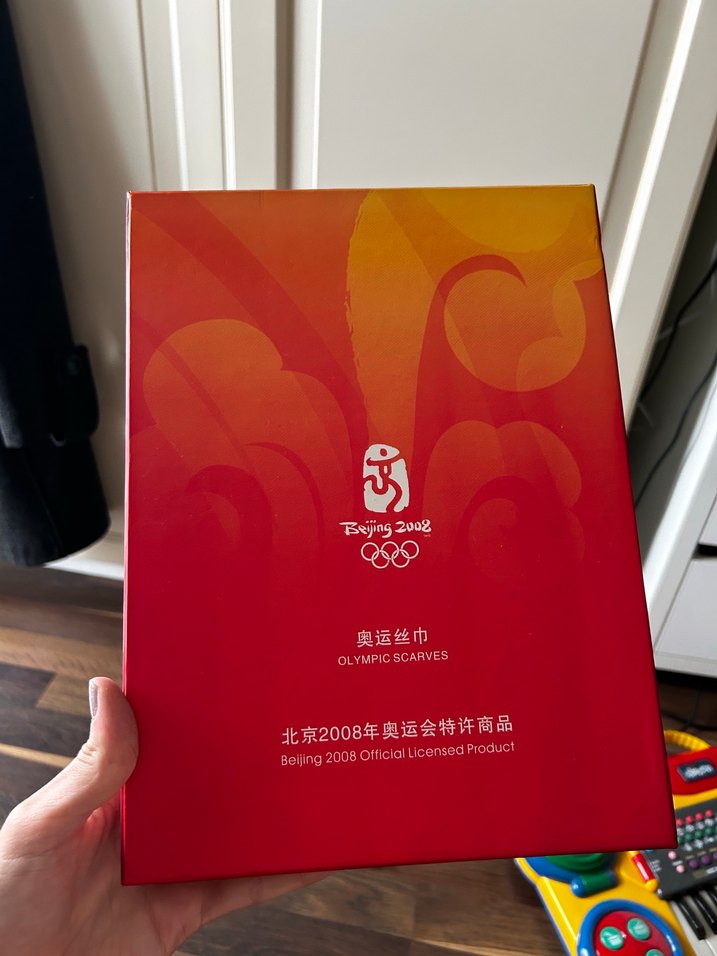 2008 Pekin Olimpiyatları'na ait resmi lisanslı olimpiyat atkısı, etiketli, hiç kullanılmadı