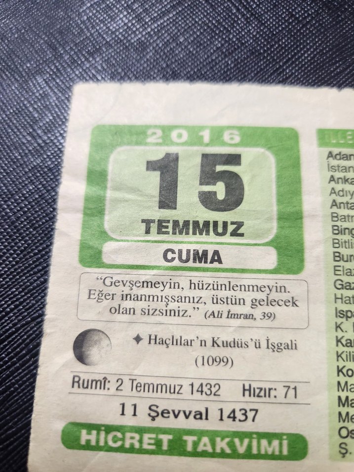 2016 yılına ait 15 Temmuz Cuma günü,tarihi bir takvim yaprağı.koleksyonluk kolay kolay denk gelmez.fiyat temsilir.SATIŞ FİYATI;120 BİNTL