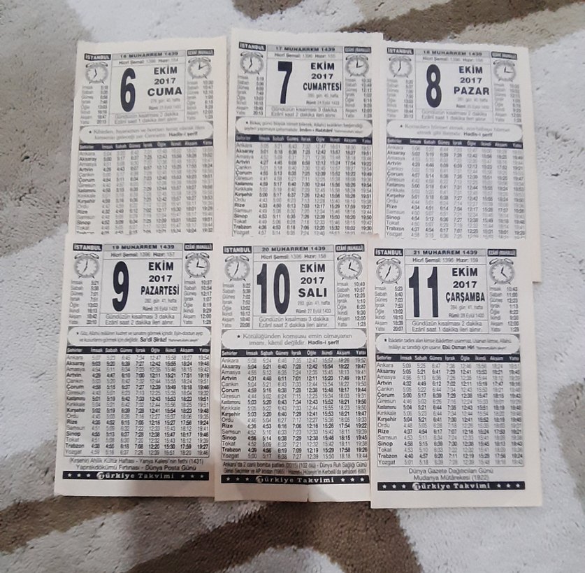 2017 Ekim ayına ait 6- ve 24 EKIM (22 EKIM hariç ) 2017 yılına ait takvim yaprakları