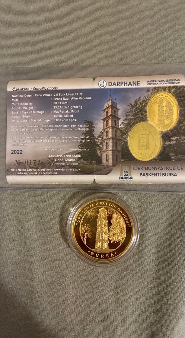 2022 tarihli, Bursa kültürünü yansıtan, altın kaplama hatıra parasıdır. Darphane onaylı sertifika ile birlikte, yaklaşık 3,35 gram ağırlığındadır.