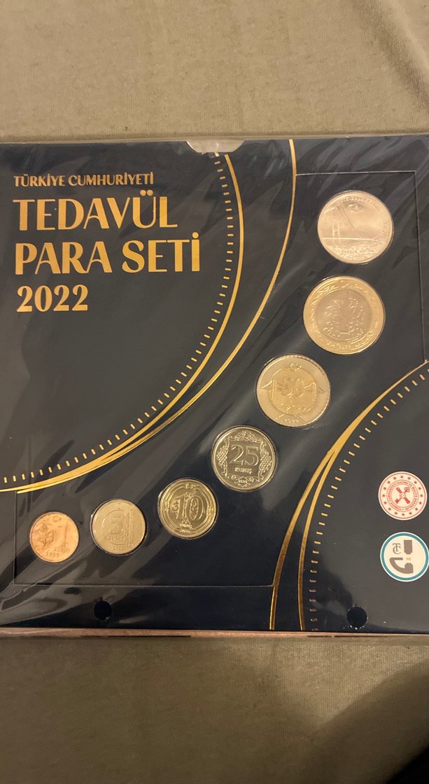 2022 yılı Türkiye Cumhuriyeti tedavül para seti, çeşitli madeni paralar içerir ve koyu renkli, altın detaylı ambalajda sunulur.