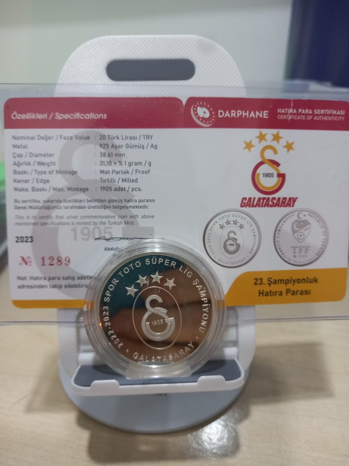 2023 yılında Galatasaray'ın 23. şampiyonluğunu kutlayan, 51 gram ağırlığında ve 38,01 mm çapında 925 ayar gümüşten yapılmış altın renkli hatıra parası. Darphane onaylı sertifikalıdır.