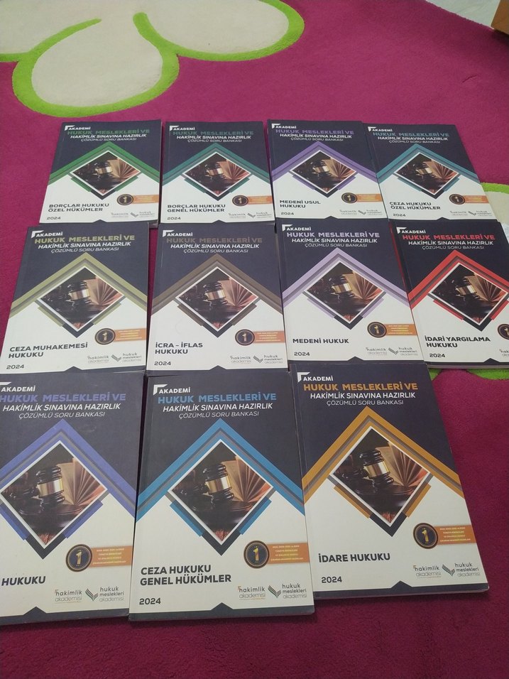 2024 için ceza hukuku, medeni hukuk, idare hukuku, iş hukuku ve genel hükümler konularını içeren sınav hazırlık kitap seti.