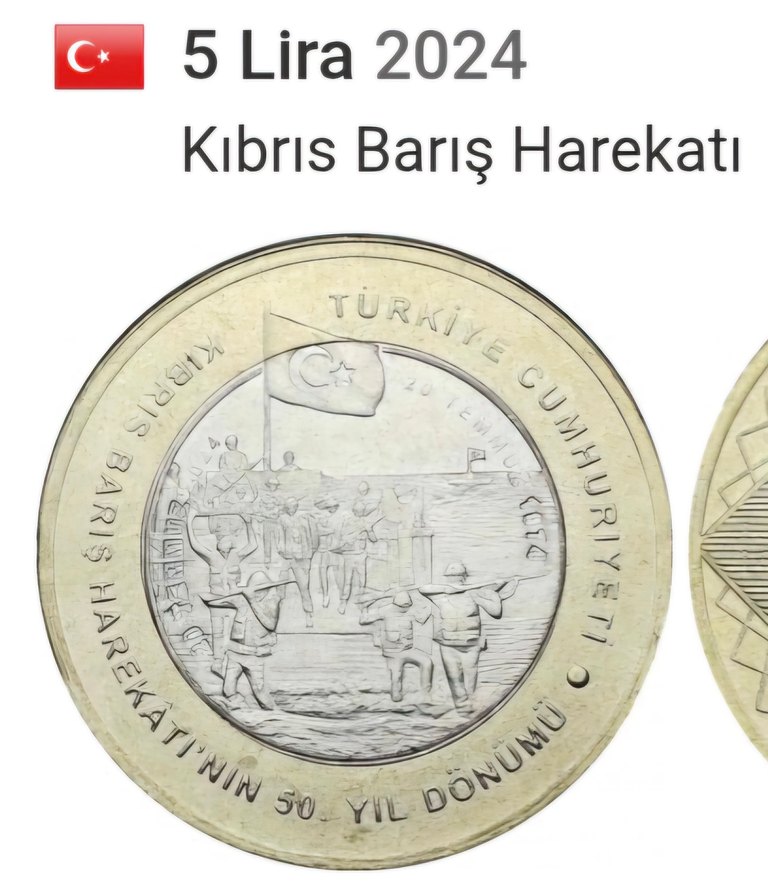 2024 tarihli bu 5 Lira hatıra parası, Kıbrıs Barış Harekatı'nın 50. yıl dönümünü kutlar. Üzerinde figürler ve Türk bayrağı yer alır. Çil üründür.
