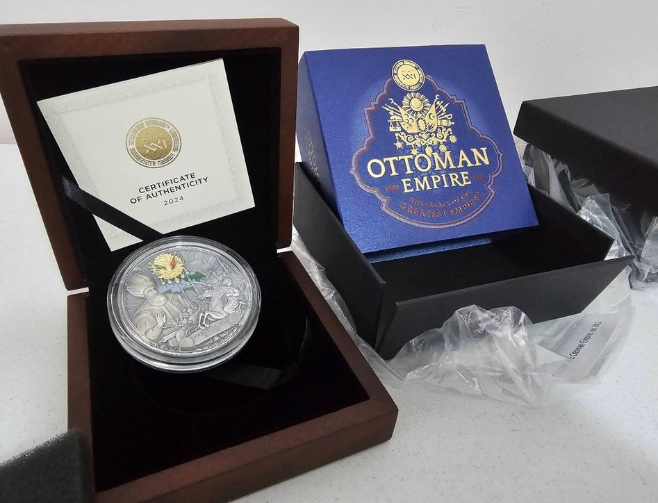 2024 Osmanlı İmparatorluğu hatıra parası, orijinallik sertifikası ve ahşap kutusunda sunulur. Dış kutusu şık tasarımlıdır. 62 gram 999 ayar saf gumusluktedir