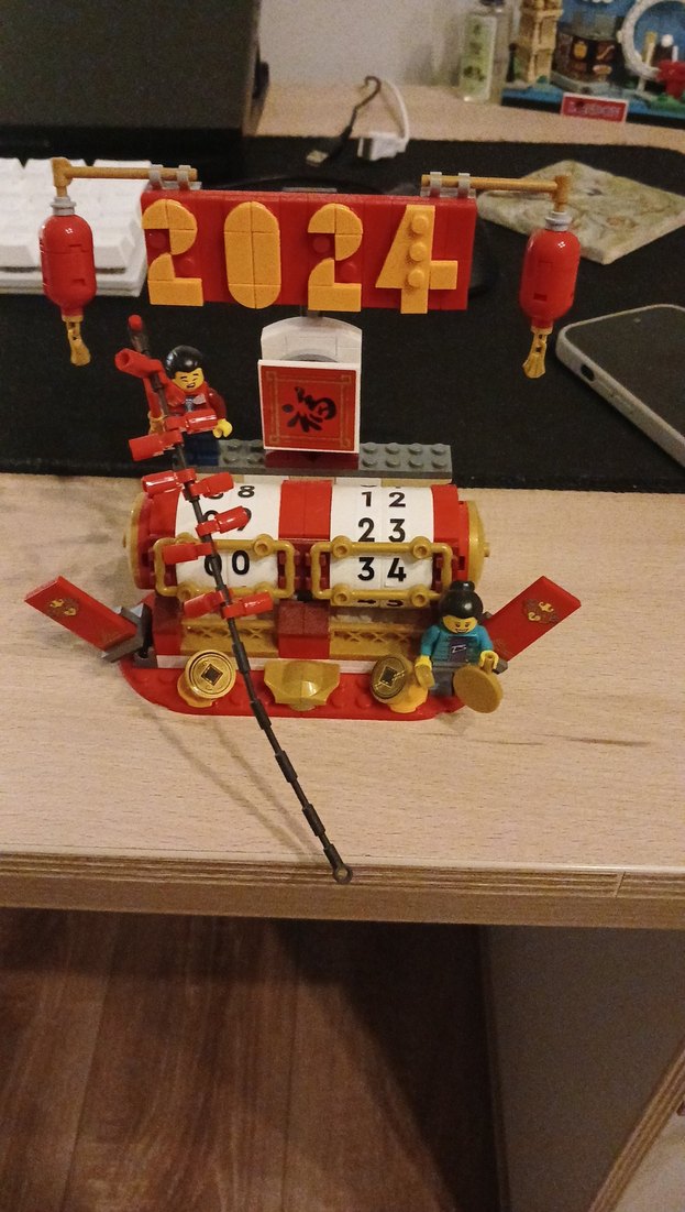 2024 yazılı, kırmızı renkli Lego setinde asılı fenerler, sayısal gösterge ve iki mini figür bulunur.