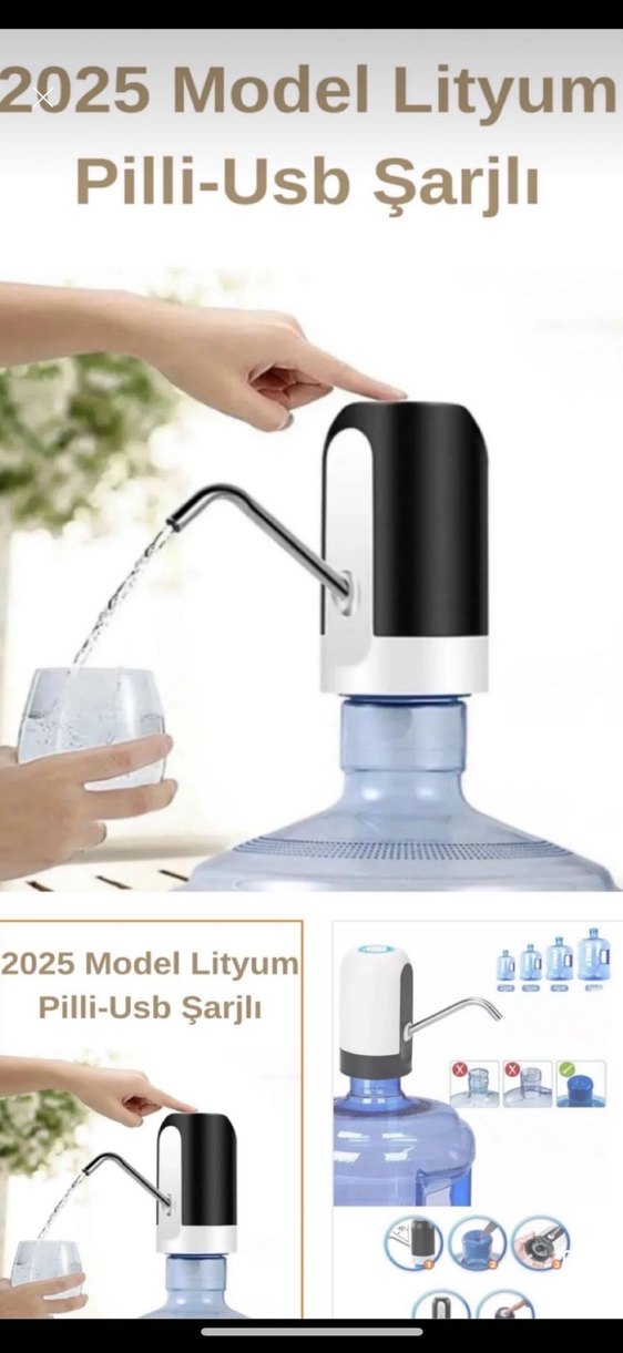 2025 model, lityum pil ve USB şarj özellikli su pompası. Büyük su şişelerine uyumlu, dokunmatik su akışı sağlar.