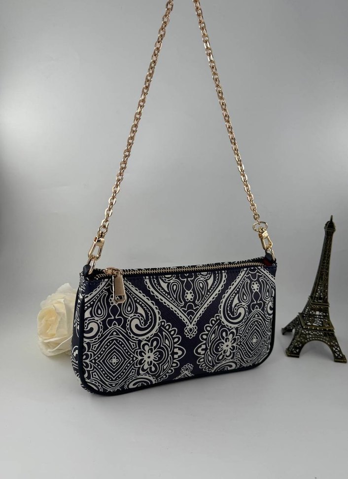 Renkli, yılan desenli sentetik kumaştan yapılmış, zincir detaylı bohem tarzda kadın çantasıdır.