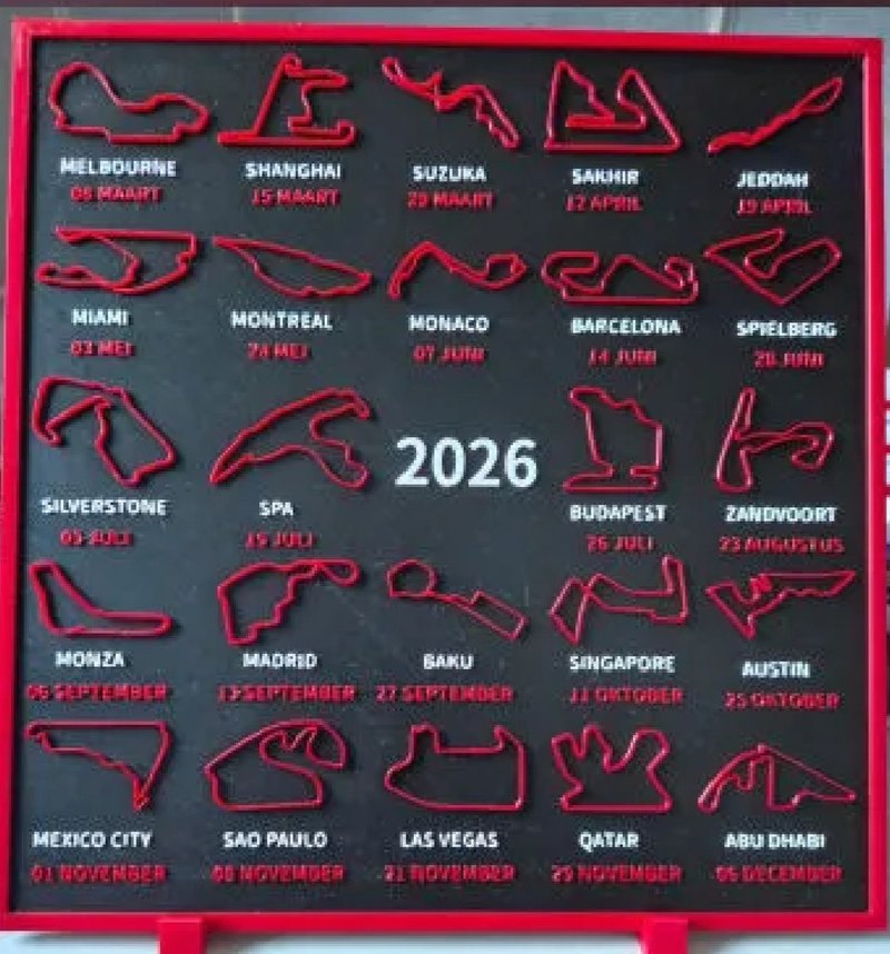 2026 yarış pistleri. Qatar, Monaco, Las Vegas ve diğerleri yer alır.
