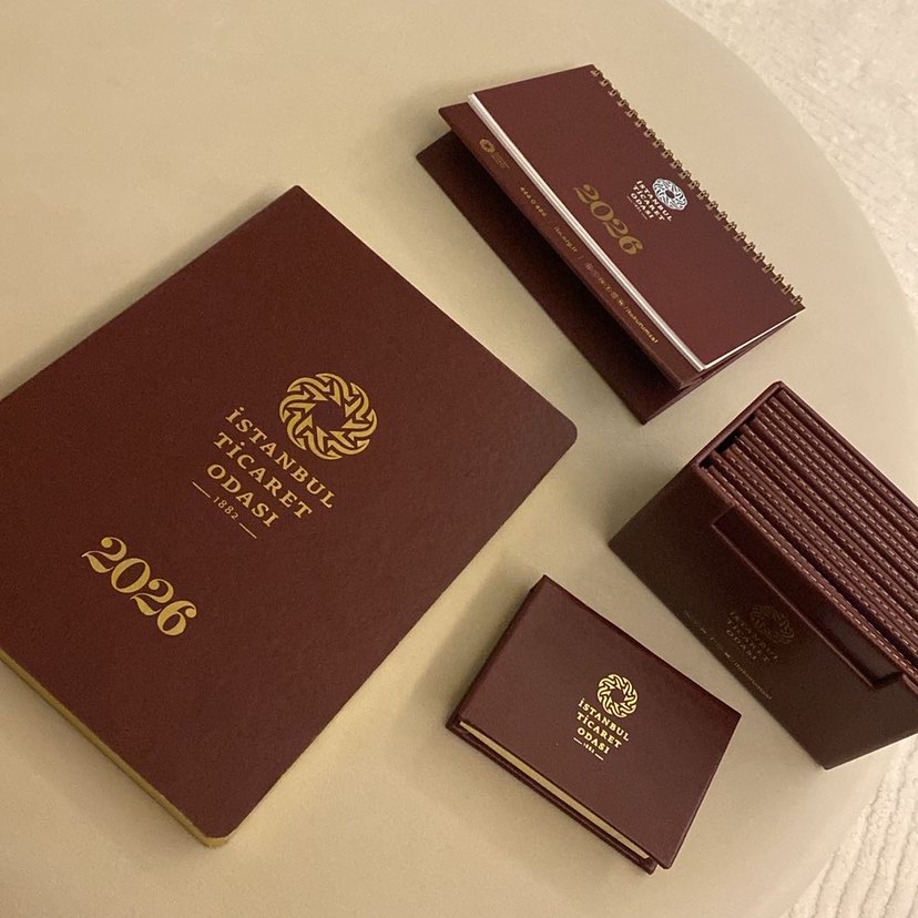 2026 tarihli, İstanbul Ticaret Odası logosu ve koyu altın detaylı planlayıcı seti; defter ve organizer içerir . Kalem ve broşu yoktur