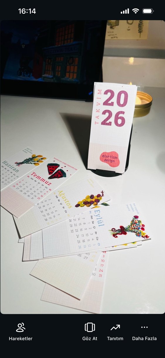 2026 yılı için beyaz ve pastel renk tonlarında, çiçek desenli aylık sayfalara sahip masa takvimi. Üzerinde net tarih numaraları ve 'elartizm design' yazısı bulunur.