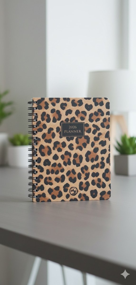 Leopar desenli koyu kahverengi kapaklı, 2026 PLANNER yazılı, spiral ciltli planlayıcı defter. ️