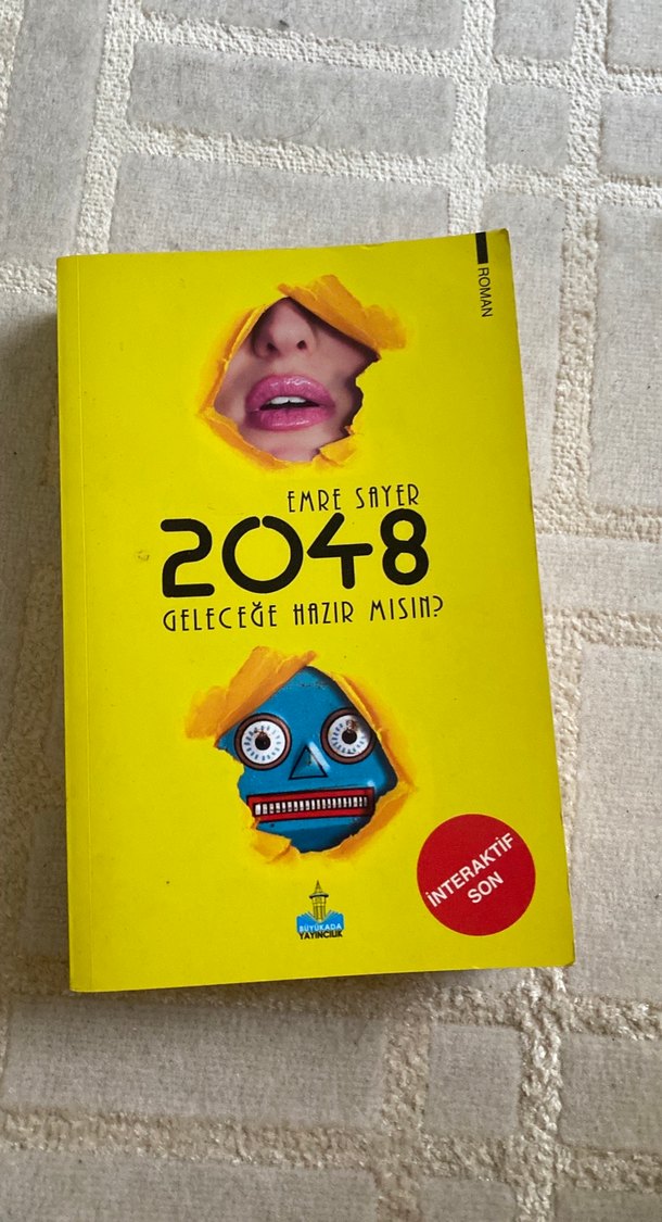Emre Sayer'in "2048 Geleceğe Hazır Mısın?" adlı romanı, interaktif sonuyla geleceğe dair temalar işliyor. Sarı kapak, insan ve robot yüzü içeriyor.