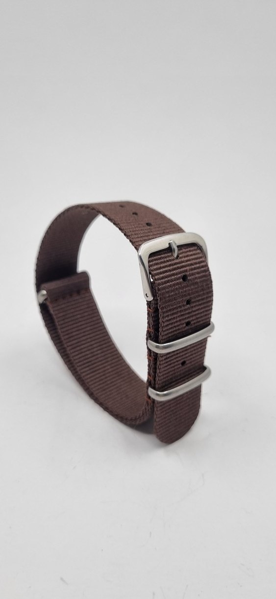 Minimalist tasarımlı kahverengi erkek saat kayışı, dayanıklı kumaş ve gümüş renk metal tokaya sahiptir. ⌚20 mm NATO saat kordonu