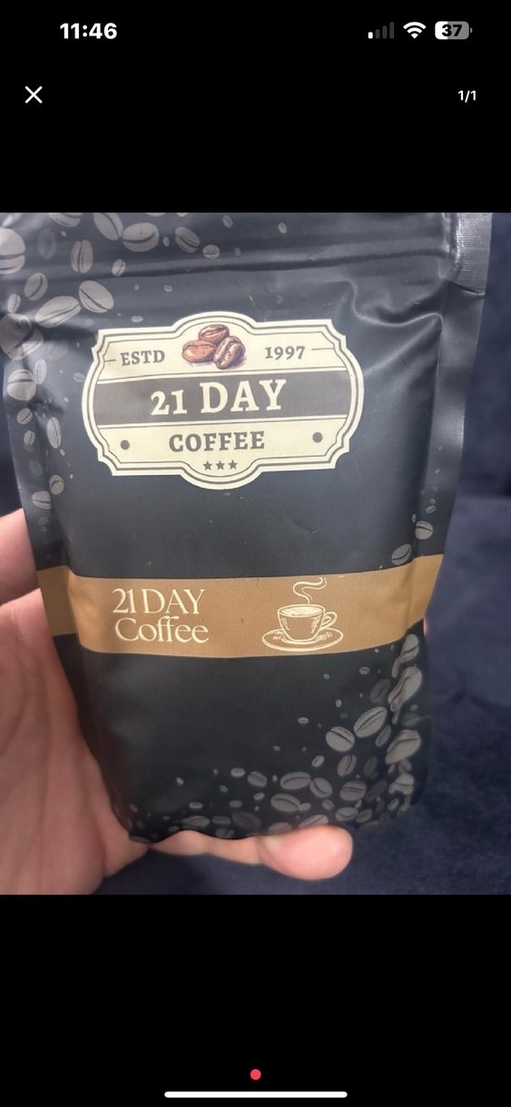 21 DAY Coffee koyu kahverengi pakette, kahve çekirdeği grafikleri ve 'ESTD 1997' etiketiyle sunulur. 21 günlük kahve markası ve buhar çıkan fincan simgesi bulunur. ☕
