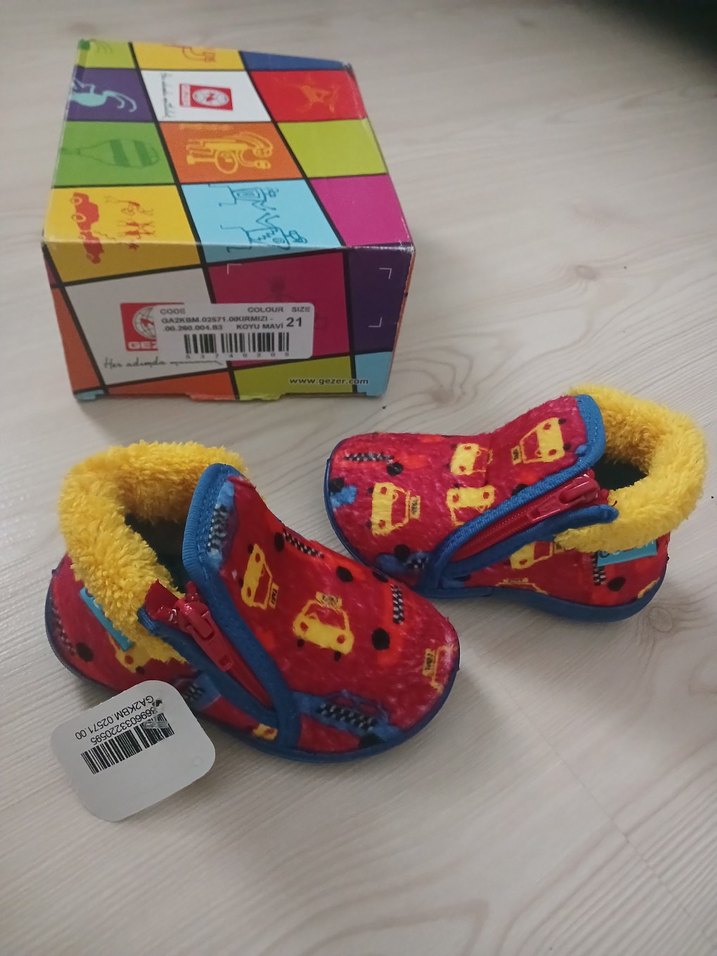 Sıfır, etiketli ev patiği/ayakabısı.Herhangi bir deformesi yoktur tertemiz saklanmıştır.Ürün sıcak tutan malzemeden yapılmıştır taban kısmı ortopedik olup bebeğinizin ayağını korur.