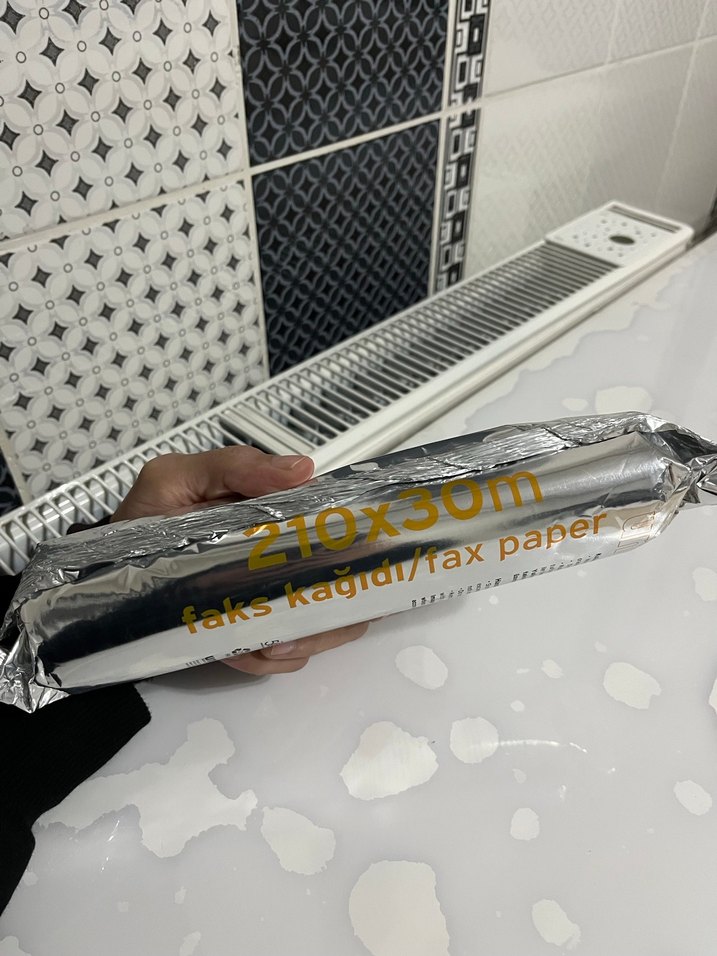210x30 metre ölçüsünde gri ve altın renkli faks kağıdı rulosu, faks makineleri için uygundur.