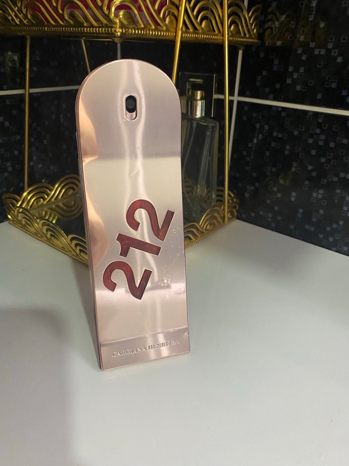 Parlak altın renkte, minimalist tasarımlı 212 numaralı kadın parfümü. Kontr-kültür stilini yansıtan şık ve modern görünüm.