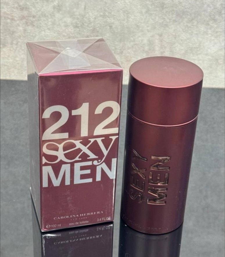 Bordo renkli, çağdaş stilde erkek parfümü. İş ortamlarına uygun, kutusunda '212 Sexy Men' yazısı bulunur.