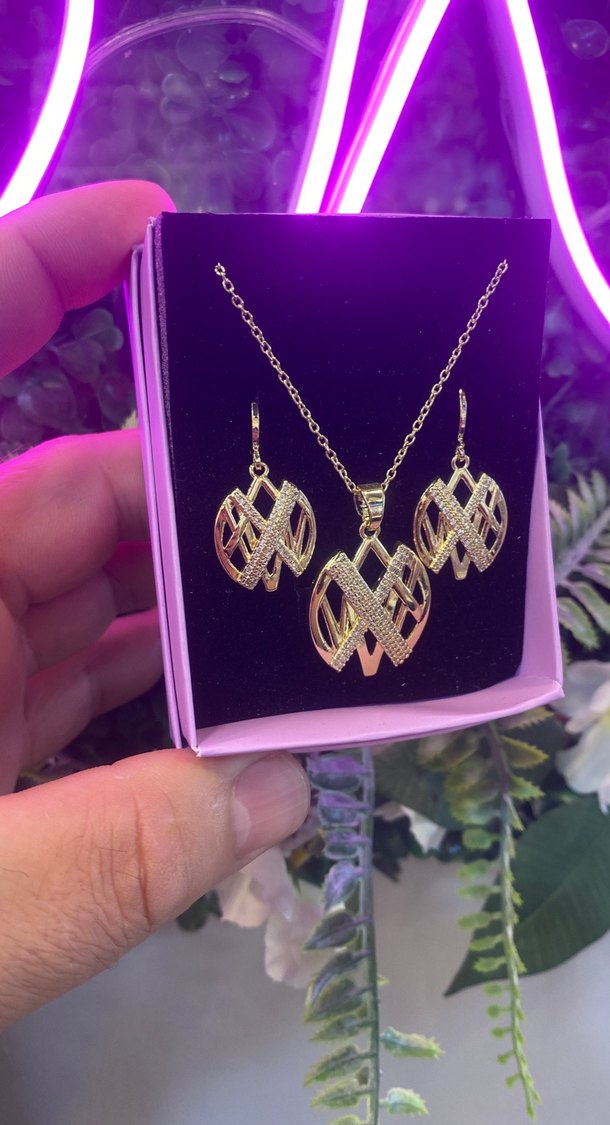 Zincir detaylı, çağdaş tasarıma sahip gold kadın takı seti. Romantik akşamlar için uygun, kolye ve küpe seti, baskılı desenli.