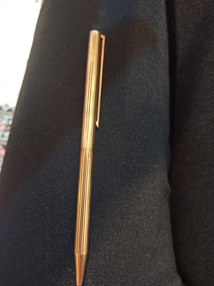 Parlak altın renkli metal tükenmez kalem, şık çizgili tasarıma ve taşıma kolaylığı sağlayan klipsli yapıya sahiptir. saat çalışıyor pil takılması gerekiyor. ikisi de 22 ayar altın kaplamadır kalem 6000 TL. saat 10.000 TL