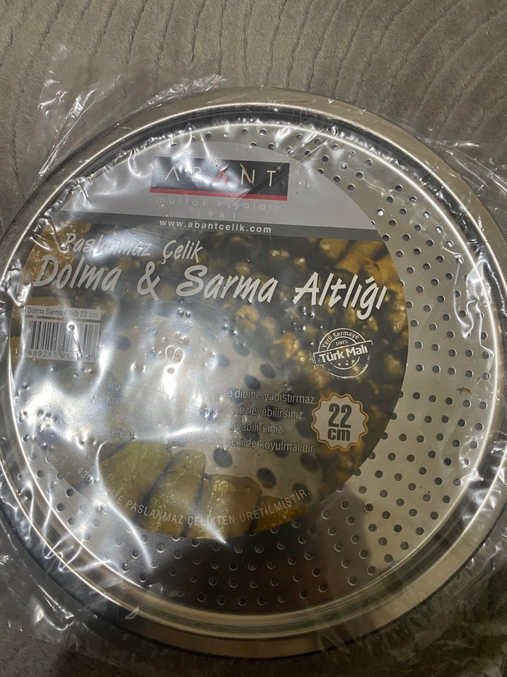 22 cm çapında, parlak altın renkli çelik dolma ve sarma altlığıdır. Paslanmaz ve dayanıklıdır.