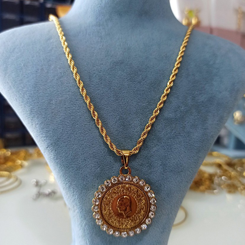 Uzun zincir detaylı, altın renkli kolyenin yuvarlak işlemeli bir ucu vardır ve çevresi küçük parlak taşlarla çevrilidir. Klasik ve sade tarza uygundur. ✨60 cm uzunluğundadır.Reşatın arkasıda mühürlü.Dügün takısı.