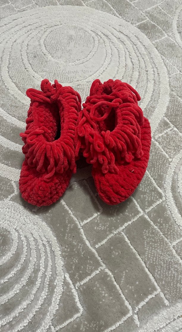 Kız çocukları için canlı kırmızı renkte örgü terlikler, sıcak ve rahat bir kullanım sunar. Bohem tarzıyla dikkat çeker.
