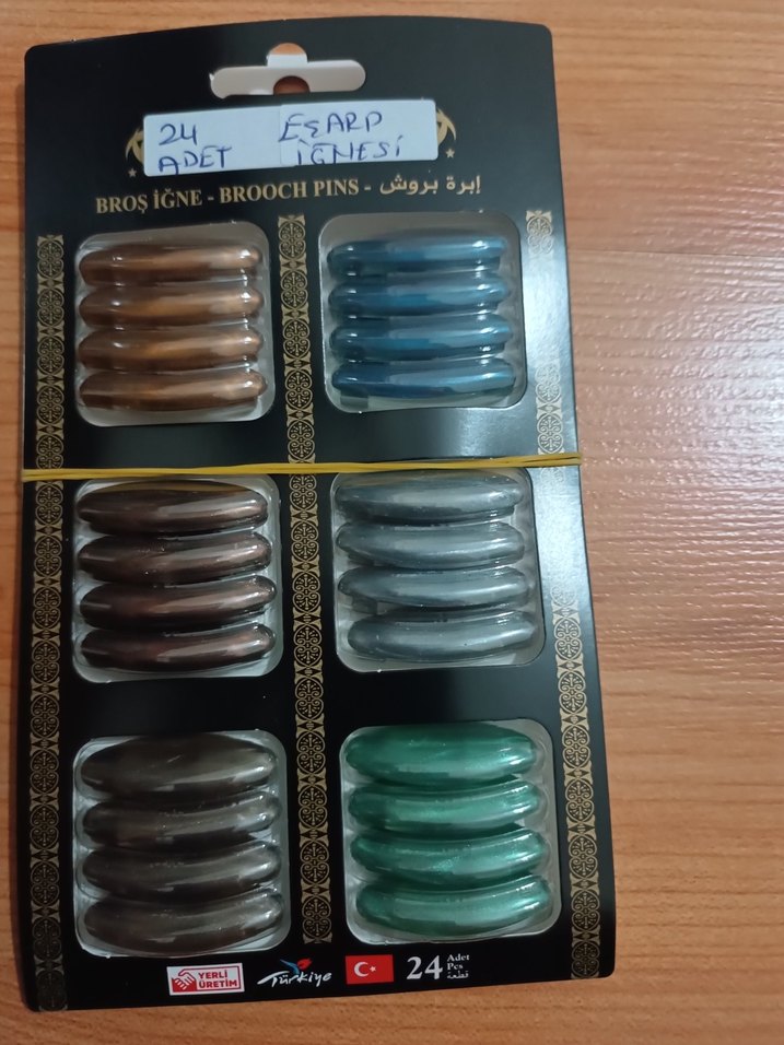 24 adet çok renkli eşarp iğnesi seti, kahverengi, mavi, koyu kahverengi, gri ve yeşil tonlarda.