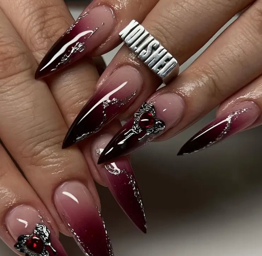 24 Adet Fransız Uzun Stileto Tırnak Seti Siyah Gradyan & Bling