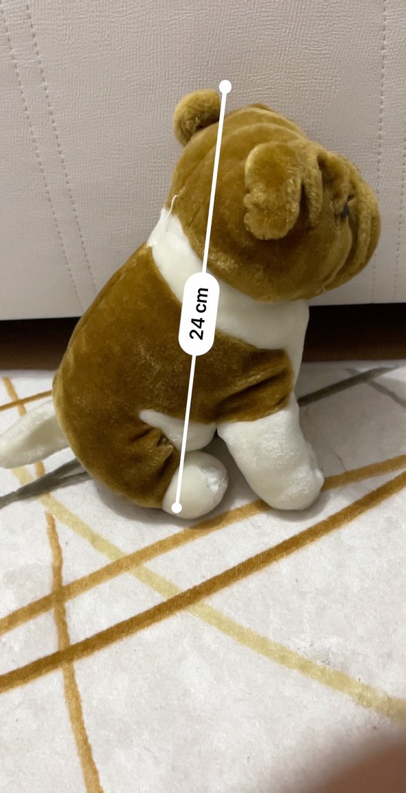 24 cm yüksekliğinde, pastel kahverengi ve beyaz yumuşak peluş oyuncak köpek. Oturur pozisyonda ve dokusu rahatlatıcıdır.