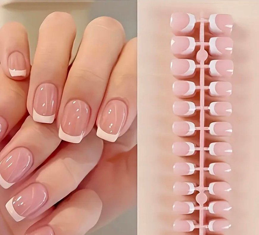 Pastel Fransız stili takma tırnak, parlak pembe yüzeyli ve doğal görünüm sağlar. Kolay uygulanır, hızlı tırnak süsleme için uygundur. Marka temsili.