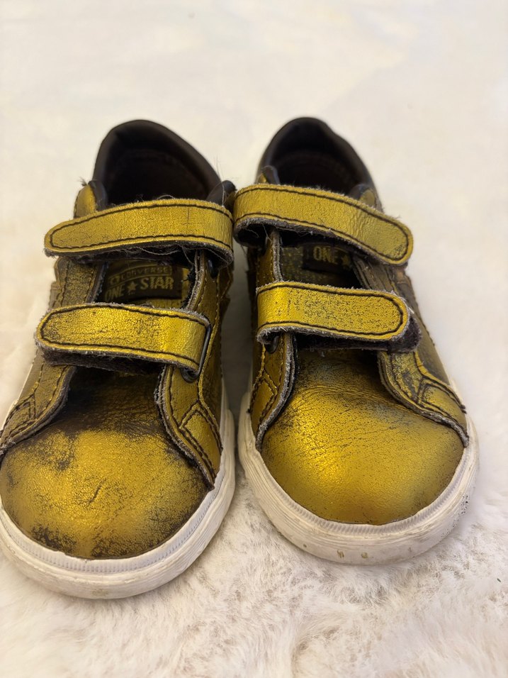 Altın renkli, parlak yüzeyli kız çocuk spor ayakkabısı. Cırt cırtlı ve kauçuk tabanlı, rock punk tarzı sokak giyimine uygun. Desensiz.