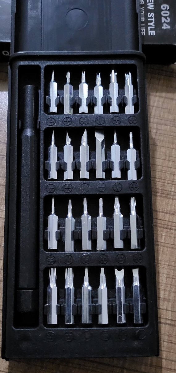 Çeşitli uç tiplerine sahip gri ve siyah tornavida uçları, kompakt siyah kutuda düzenlenmiş. Hassas işler için uygundur. ️