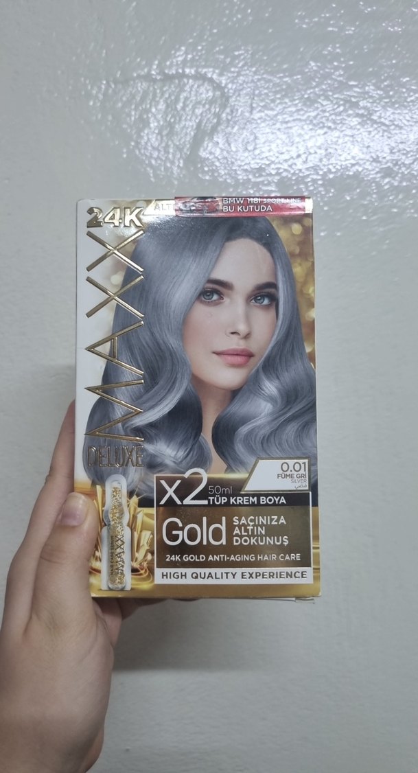 24K altın anti-aging bakımlı, saf gri (0.01) renkte saç boyası. İki adet 50ml krem tüp içerir. ✨ saçım sarıyken almıştım gri yaparım diye ancak siyaha boyadım evde kalmasındansa bir başkası alsın