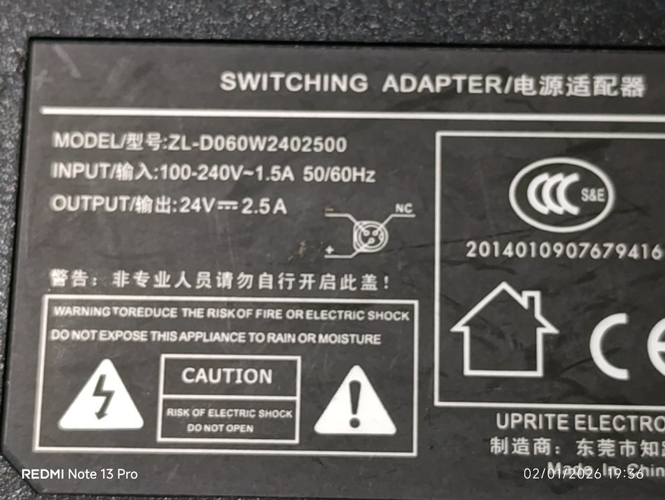 24V çıkışlı ve 2.5A akımlı siyah anahtarlamalı adaptör. 100-240V giriş voltajı ve 50/60Hz frekans destekler. Elektrik çarpması ve yangın riski uyarıları içerir. ⚡