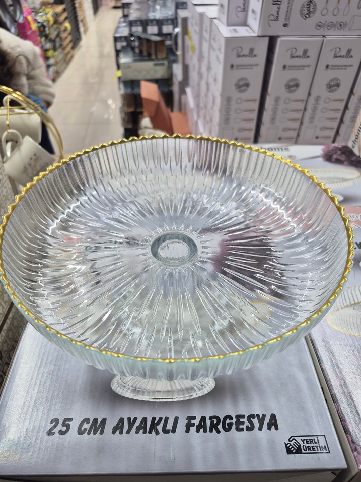 25 cm çapında, ayaklı cam servis tabağı. Altın renkli detayları ve modern klasik tasarımıyla sofralara şıklık katar. ️