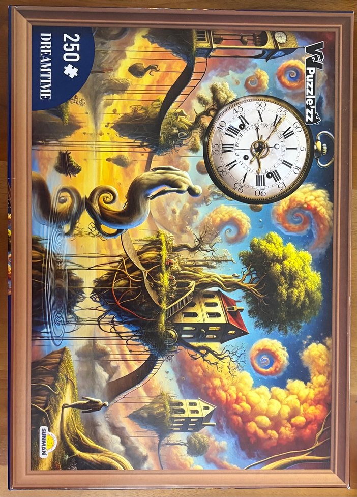 250 parçadan oluşan Dreamtime puzzle, büyük saat ve canlı altın tonlarıyla karanlık temalı sürreal bir sanat eserini içerir. Puzzle'z tarafından üretilmiştir.
