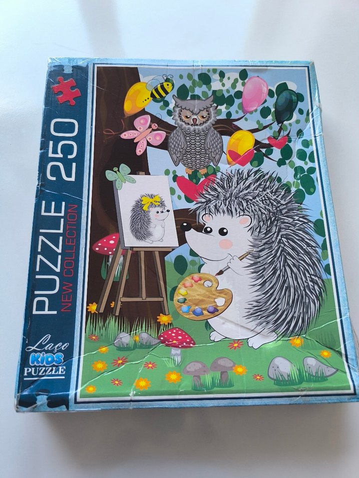 Ormanda resim yapan kirpi, baykuş ve kelebek figürlü 250 parçalık pastel renkli çocuk puzzle'ı. Laco Kids koleksiyonundan.Sadece 3 parçası sorunlu yapıştıraşa bilir